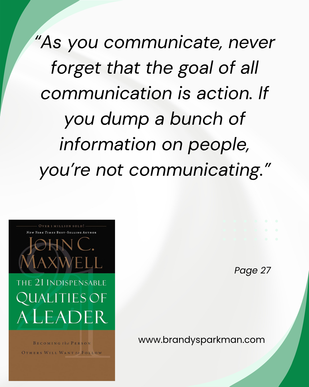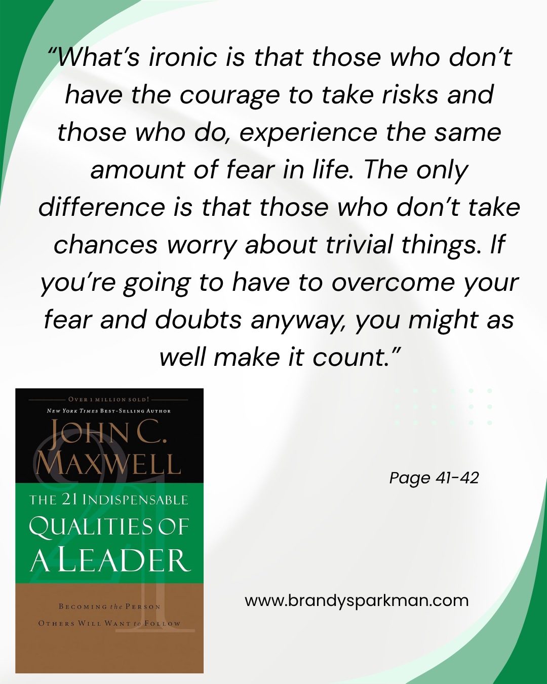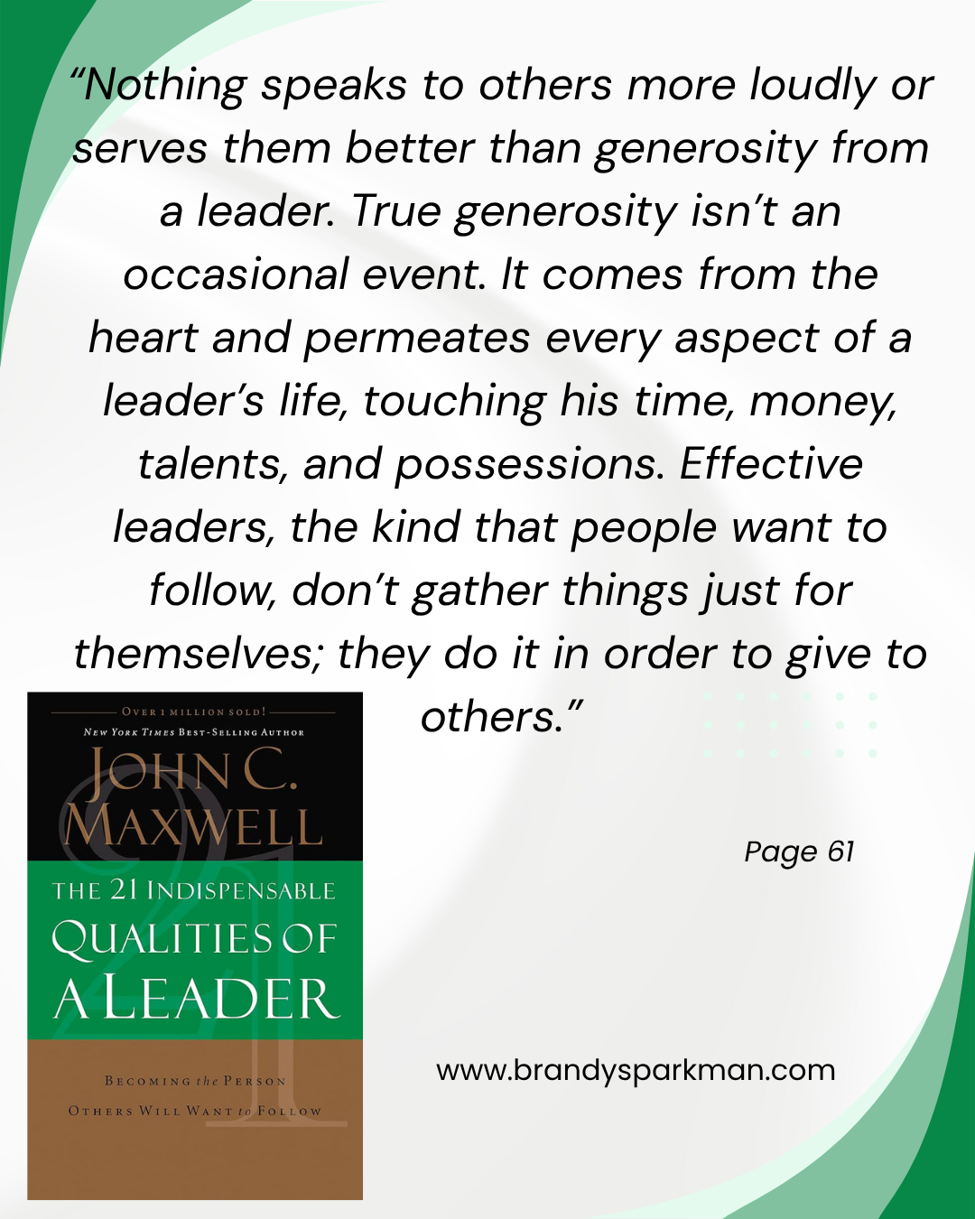 “Vision is everything for a leader. It is utterly indispensable. Why? Because vision leads the leader. It paints the target. It sparks and fuels the fire within, and draws him forward. It is also the fire lighter for others who follow that leader. Show me a leader without vision, and I’ll show you someone who isn’t going anywhere. At best, he is traveling in circles.” -page 150